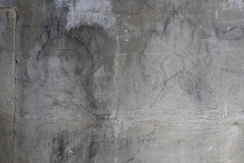 Neben den Profilen bilden die Reliefs die zweite große Gruppe der bildhauerischen Oberflächengestaltung. Apsaras und Dervatas bedecken zu tausenden die gestalteten Wandflächen der Tempel in Angkor, vielfältige und faszinierende Darstellungen zeugen von der großartigen Kunstfertigkeit der Khmer-Bildhauer. Aus der großen Vielfalt unterschiedlichster Relieftechniken kann hier nur eine kleine Auswahl dargestellt werden, zunächst eine sehr flach gearbeitete Figurengruppe mit Ornamenten im Angkor Wat. Auch hier finden sich unterschiedliche Stadien, zunächst die Vorzeichnung, die mit einem Pinsel und schwarzer Farbe angezeichnet wurde. Im nächsten Schritt sind die Umrisse in großen Teilen schon nachgraviert, auch dies wurde mit einem schmalen, feinen Eisen durchgeführt. Auf dem nächsten Bild sieht man bereits die groben Umrisse, die kleine Figur in der Mitte ist ebenfalls angelegt. Auf dem letzten Bild ist der florale Schmuck bereits weitgehend fertig und die beiden Apsaras in zwei verschiedenen Zuständen: die rechte als Umriss eingraviert, die linke weitgehend als Flachrelief ausgearbeitet. Hier kamen sicher sehr feine Werkzeuge zum Einsatz, mit einer Schneidebreite von etwa 3-10 mm.