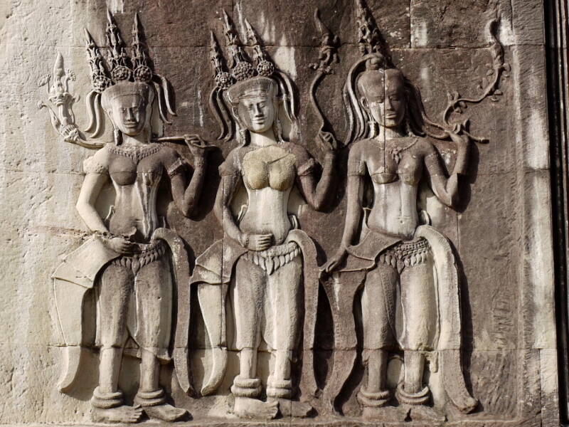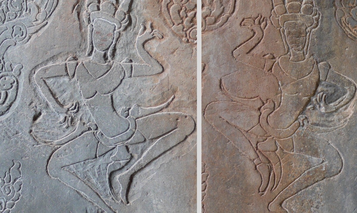 Als zweites Beispiel für eine bildhauerische Arbeit eignen sich die unfertigen Devatas am Angkor Wat. Auch hier sieht man links den eingravierten Umriss, die einstige Vorzeichnung ist hier durch die Bewitterung längst verloren. In der Mitte wurde die Figur bereits plastisch angelegt und in die Tiefe gearbeitet. Es sind punktförmige Hiebe sichtbar, erzeugt durch das steil geführte Eisen, daneben mit dem gleichen Werkzeug linear angelegte Oberflächen. Rechts schließlich die fast fertige Figur, die Oberfläche wurde auch hier geglättet und die feine Ornamentik teilweise angelegt. Es ist ein besonderer Glücksfall, dass sich an der östlichen Galerie insgesamt etwa 10 unvollendeten Figuren erhalten haben. Dadurch bekommen wir einen unverfälschten Einblick in die bildhauerische Arbeitstechnik.
