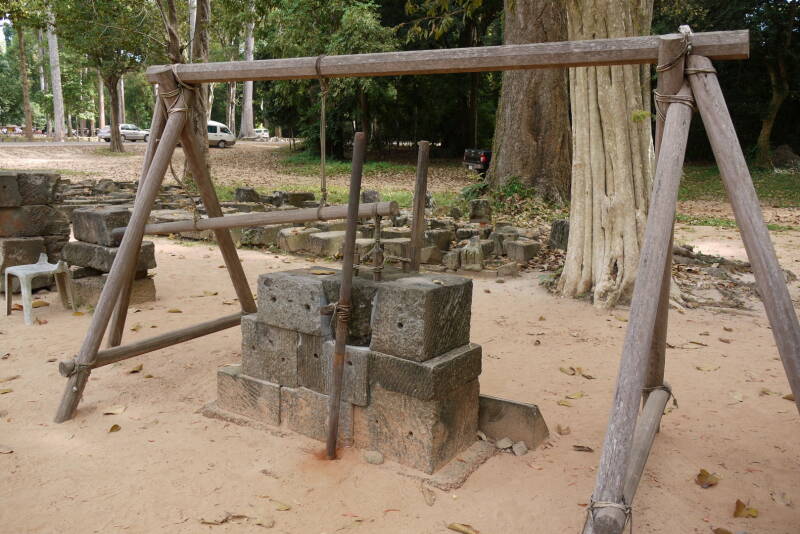 Außer den Baubefunden gibt es leider auch hier kaum Hinweise auf die Bautechnik der Khmer. Lediglich die Reliefs des Bayon-Tempels (Ende 12. Jh.) dienen - wie schon beim Steinabbau erwähnt - seit langem als Erklärung für den schwierigen Prozess der Mauerherstellung. Dieses Relief zeigt ein hölzernes Gestell, an dem eine Hebevorrichtung mit einem sehr großen Hebelarm hängt. Damit hebt ein Arbeiter den Stein an, zwei weitere bewegen ihn hin und her und schleifen ihn durch die abrasiven Körner des Sandsteins passgenau an den nächsten Stein, so dass die oben gezeigten, sehr feinen Pressfugen entstehen. Dabei wird auch die Funktion der eingesteckten Holzpflöcke als Haltevorrichtung ersichtlich. Die Rekonstruktion eines solchen Gerätes steht heute vor dem Bayon-Tempel.
