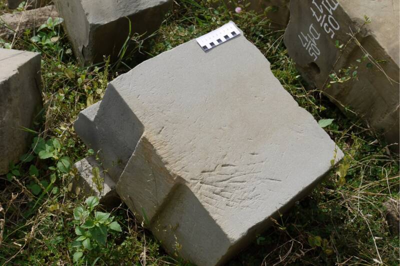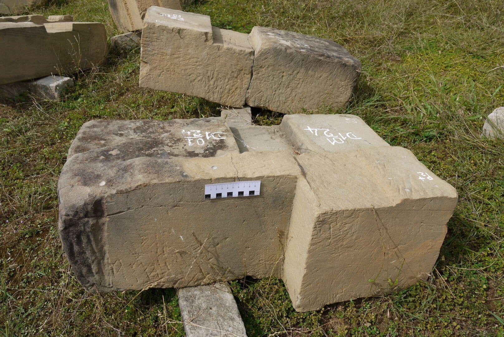Die Quader haben teilweise sehr komplexe Formen. Man erkennt die aufgezeichneten Nummerierungen für die spätere Wiedermontage. Foto: P. Völkle ©