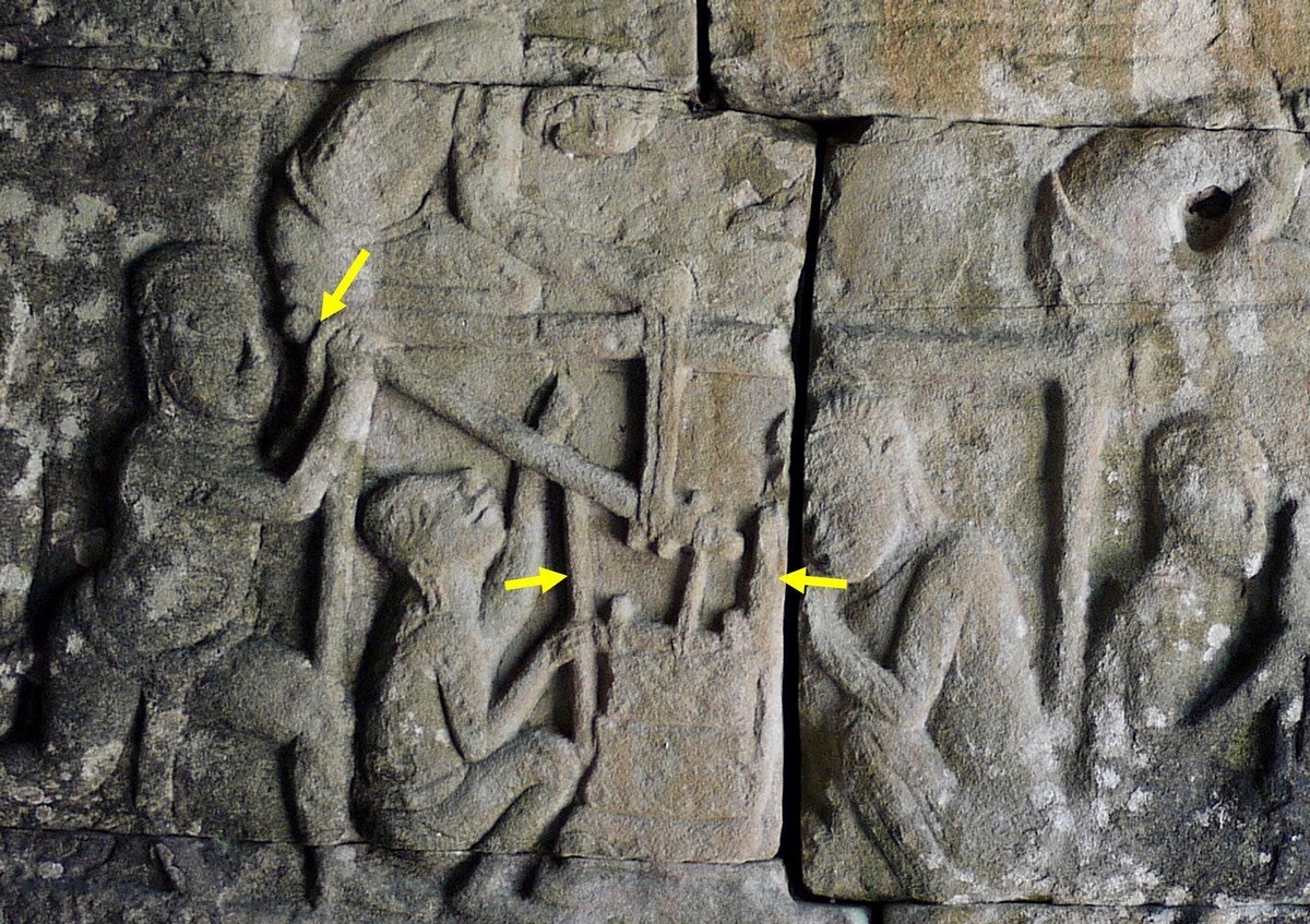 Mangels schriftlicher oder bildlicher Quellen lassen sich die meisten Erkenntnisse über die bautechnischen Aspekte in Angkor nur anhand der erhaltenen Spuren erklären bzw. rekonstruieren. Dies gilt auch für den Steinabbau. Allerdings gibt es hier einen weiteren kleinen Hinweis auf die mögliche Abbautechnik: Auf einer Reliefdarstellung am Bayon-Tempel (Ende 12./Anfang 13. Jh.) sieht man in der nebenstehenden Abbildung vier Männer, die mit senkrecht gehaltenen Stangen hantieren. Wird hier der Abbau der Steine mit Eisenstangen im Steinbruch gezeigt? Nach den Spuren zu schließen, wäre dies durchaus möglich, man kann sich den Vorgang ähnlich wie im Film beim Lateritabbau vorstellen.