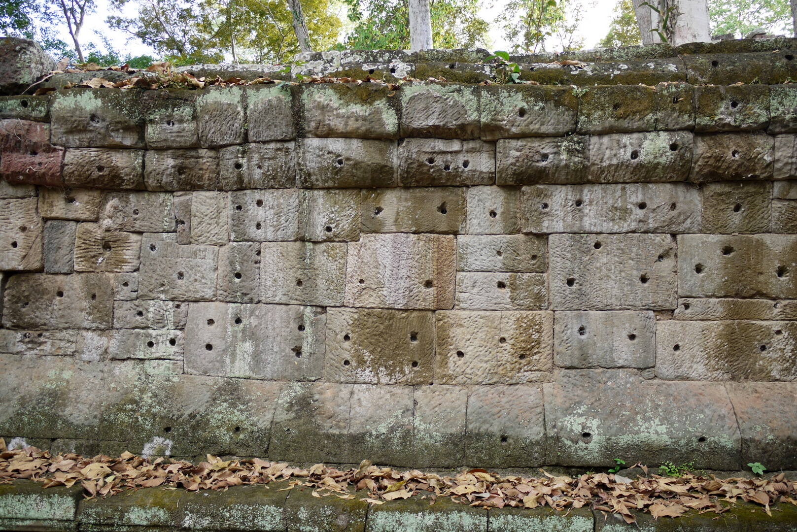 An unzähligen Steinblöcken der Tempel von Angkor fallen die runden Löcher in der Steinoberfläche auf. Sie befinden sich sowohl an den seitlichen vertikalen als auch an den horizontalen Flächen. So wird angenommen, dass in diese Löcher Holzpflöcke gesteckt wurden um die Quader anzuheben bzw. zu bewegen (siehe auch weiter unten). Durch die spätere Bearbeitung der Oberfläche sind viele, aber bei weitem nicht alle dieser Löcher verschwunden.