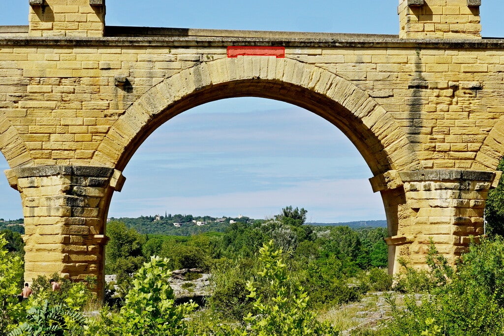 Links der unterste Bogen des Pont du Gard, rechts der Brückenbogen von Henri Pitot,  ca. 1745. Foto: P. Völkle ©