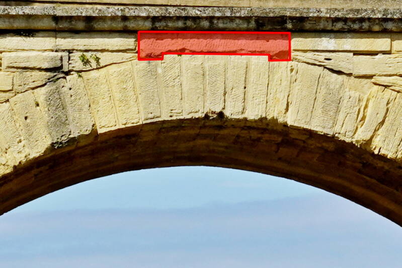 Der untere Bogen mit den sorgfältig keilförmig ausgearbeiteten Bogensteinen. Am Scheitel werden die Bogensteine mit einem langen Stein klammerartig zusammengehalten (rot markiert). Foto: P. Völkle ©